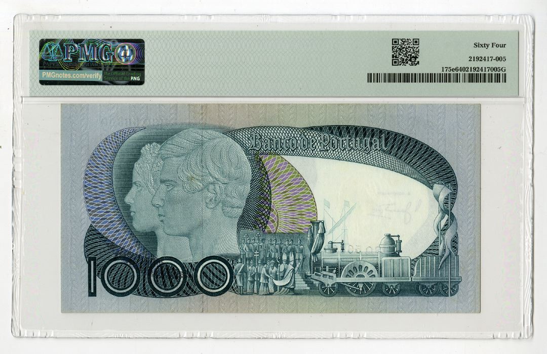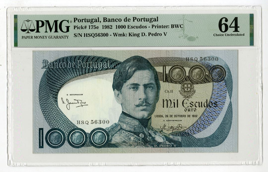 Portugal, 1982. 1000 Escudos, P-175e, Issued Banknote, Blue and black on m/c underprint, Dom Pedro V at right, S/N HSQ56300, PMG graded Choice Uncirculated 64, BWC.
