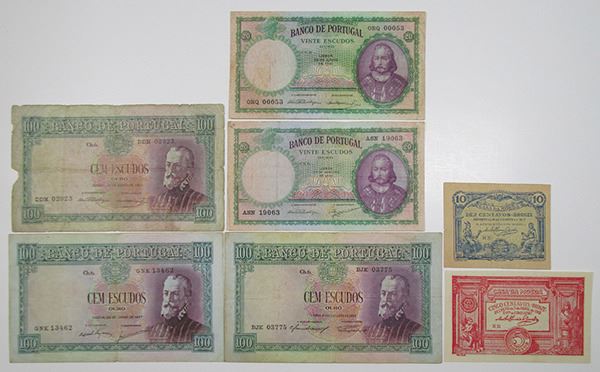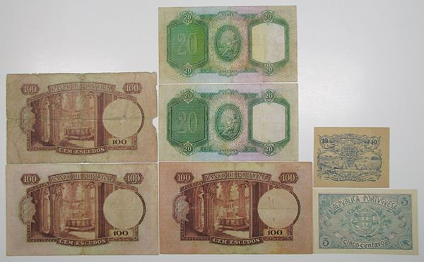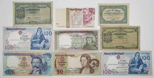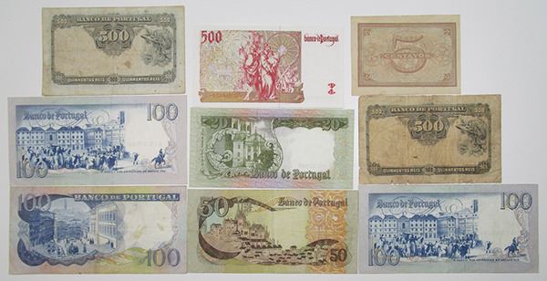 PortugalÉ. Lot includes a trio of earlier issue 5 Centavos and 500 Reis, together with half a dozen 20, 50, 100, 500 Escudos notes from 1960s-1990s issues. P-98; 105 (2); 167; 169; 174; 178 (2); 187. Fine to VF. (9)
