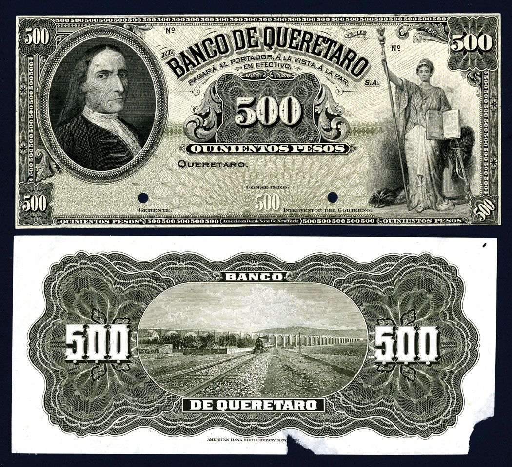 Queretaro, Mexico. 19xx (ca. 1903-10), 500 Pesos, P-S395p (Unlisted as proof), Proof face and Back printed on india paper that is unmounted with small faults, the face appears Uncirculated but there is a small 2 mm internal tear on the left margin. ABNC.