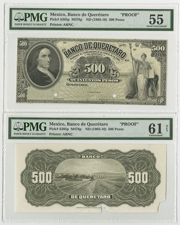 Queretaro, Mexico..... 19xx (ca. 1903-10), 500 Pesos, P-S395p M478p (Unlisted as proof), Proof face and Back printed on india paper that is unmounted with small faults, the face is PMG graded About Uncirculated 55 with note of previously mounted and the back is Uncirculated 61 NET with note of printer's annotation, tear and small pieces missing from bottom middle and right, Rare high denomination proof that is only available in this form. ABNC.
