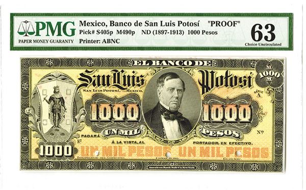 San Luis Potosi, Mexico, 1000 Pesos, P-S405p, Uniface front proof printed on thin india paper, Black on light yellow and orange, portrait of gentleman in middle, Arms at left, blank back, PMG graded Choice Uncirculated 63 with POC's, cut close. ABNC. Rare high denomination note that is rarely seen at auction.