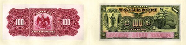 Mexico. San Luis Potosi. ca. 1897-1913. P-S403p. 100 Pesos. Obverse and reverse proofs printed on India paper and mounted on large card stock. Black on yellow, orange and red underprint. Seated allegorical 'Commerce' at right, state arms at left. Choice UNC. Very rare in any form. ABNC.