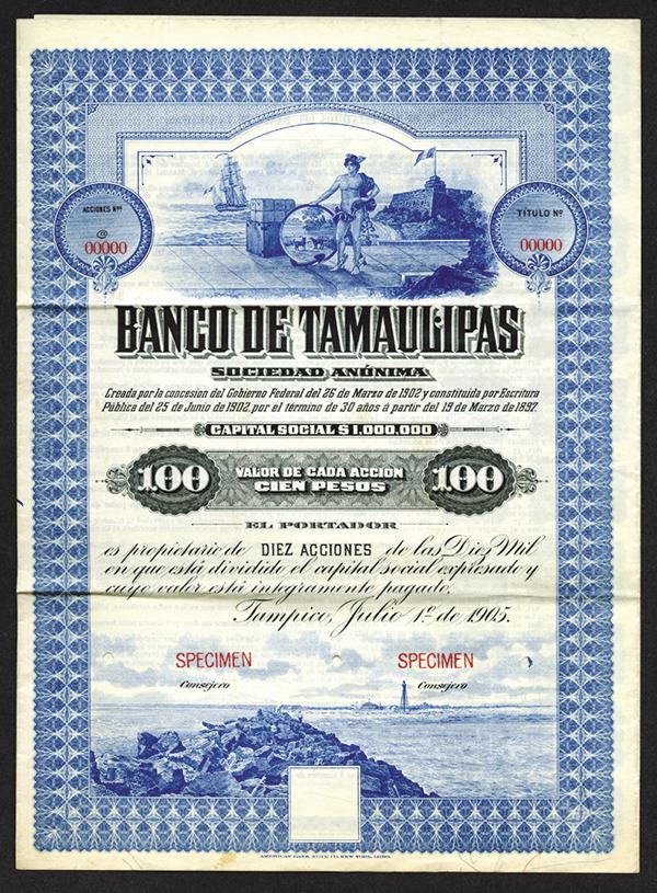 Mexico. $100 Pesos=10 Shares, Specimen Bond. Black with blue border and under print. Vignette of Mercury in robe with Galleon sailing in the distance and a fort on the right at top and at bottom of certificate a rock pier. Specimen overprints, POC's, VF-XF condition, ABNC.