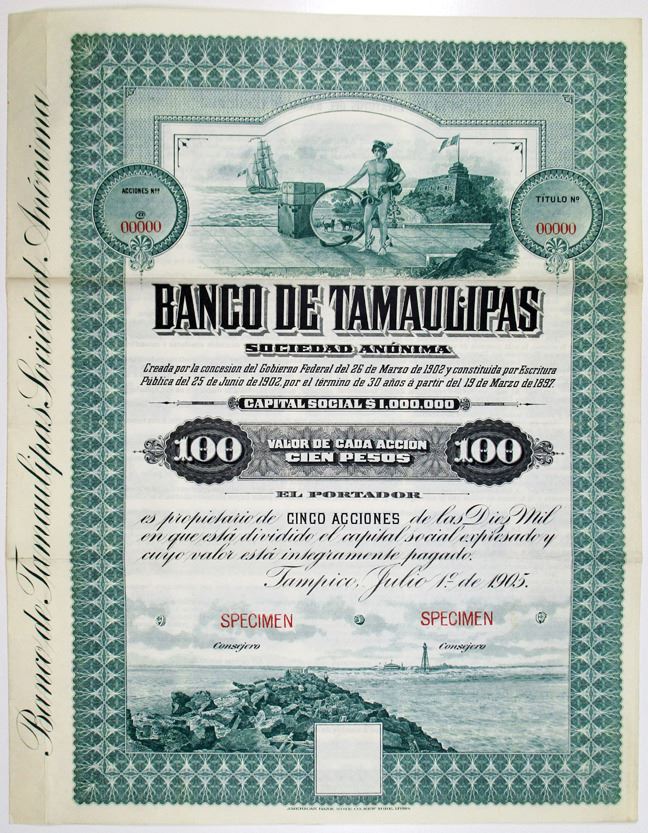 Mexico 1905. 100 Pesos for One Share Specimen Stock Certificate with Coupons, in Spanish, Black text with green border, Allegorical Hermes with ocean scene in background. Red specimen overprints, 00000 serial numbers, and POCs. Fine-VF condition, ABNC.