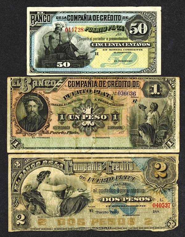 Dominican Republic. 1880's Issue. 1, 2 Pesos. P-S103r, S104r. With serial # but no signatures or date. Very Good with rough edges. 1889 Issue. 50 Centavos. S112. Fine, a few edge nocks. 3 pieces.