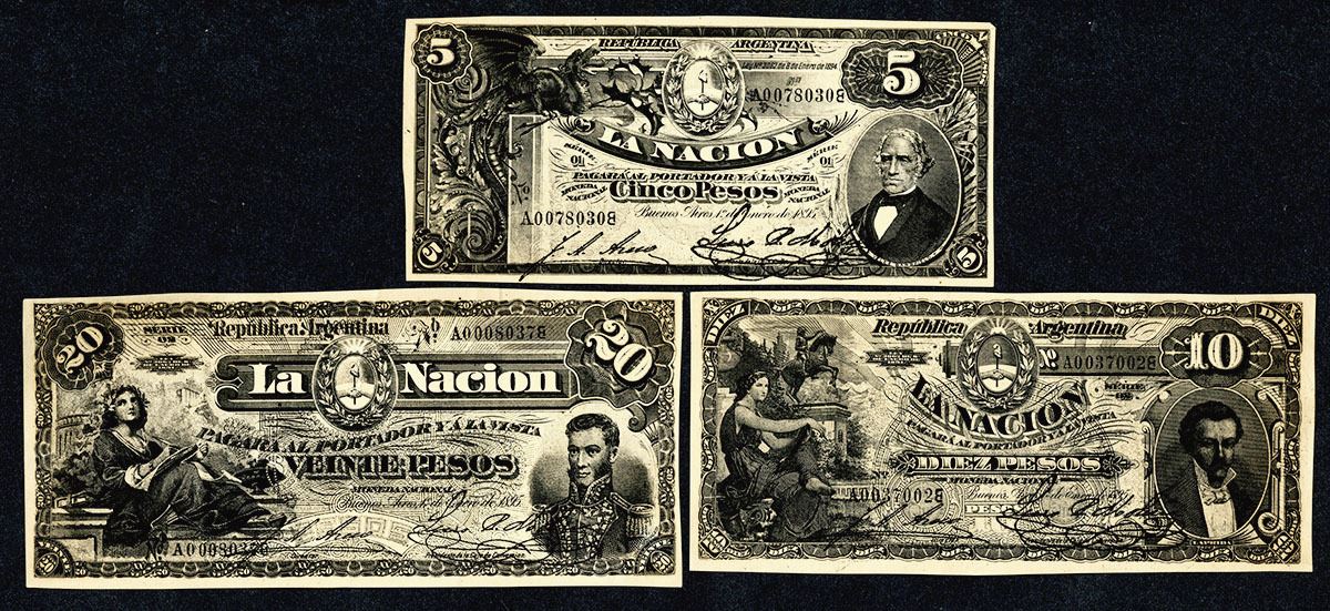 Argentina, 1894 (1895). Lot of 3 Photo Proofs, Includes: 5 Pesos, P-220p Unlisted, Black and white with Dragon at left arms at center and portrait of V. Sarsfield at right, S/N A0078030B; 10 Pesos, P-221p Unlisted, Black and white with woman and monument at left arms at center and portrait of N. Lapira at right, S/N A0037002B; 20 Pesos, P-222p Unlisted, Black and white with seated woman writing at left arms at center and portrait of Arenales at right, S/N A0008037B. Notes range from XF to AU condition and printed by CSABB Buenos Aires. These were from an American Bank Note Company design file and were evidently reference items, possibly for text and design style. (3). Sold "AS IS" no returns accepted.