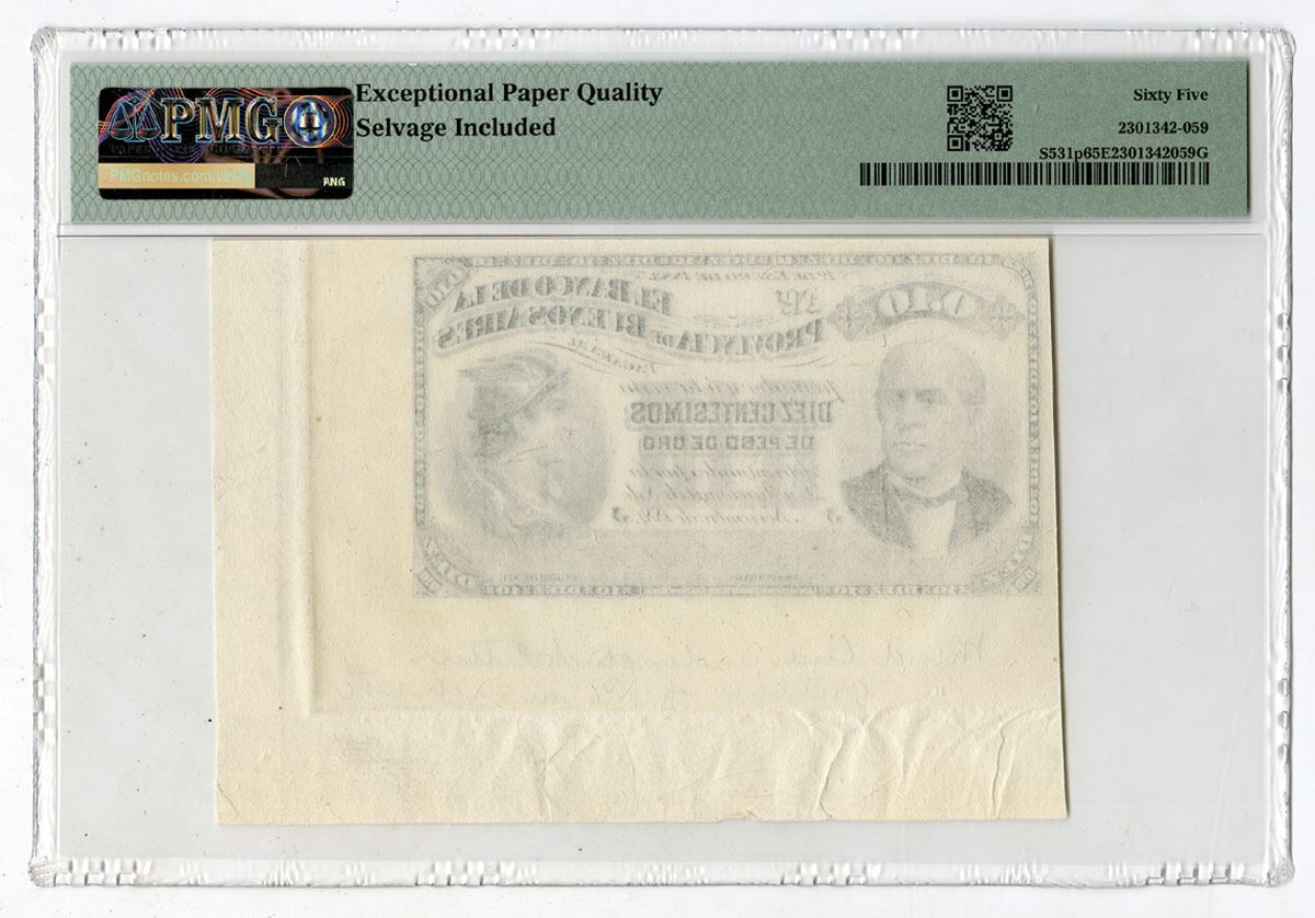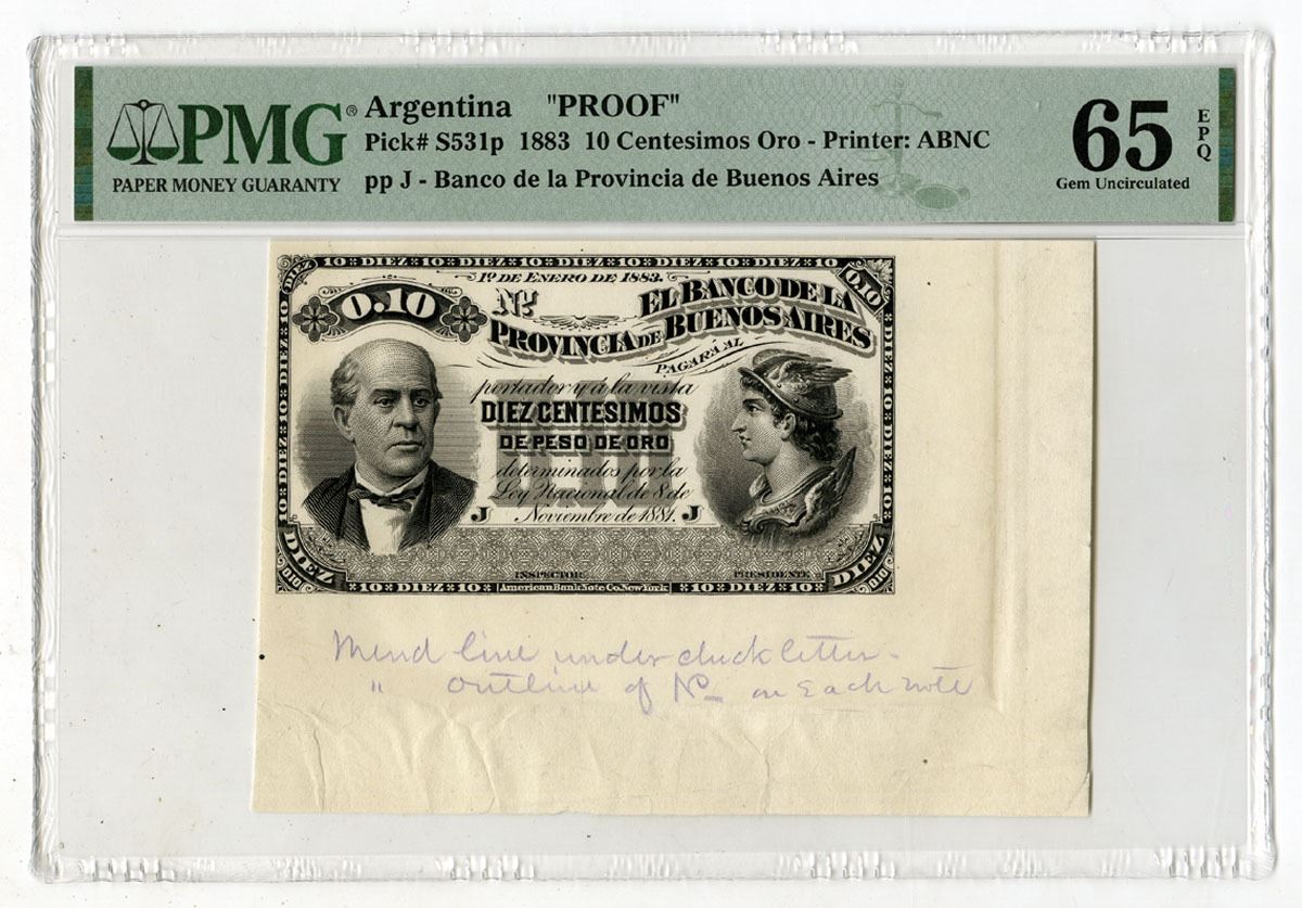 Buenos Aires, Argentina, 1883. 10 Centesimos Oro, P-S531p, Proof Banknote, Black printing with Portrait of Dr. Sarmiento at left and Mercury at right, Uniface note, PMG graded Gem Uncirculated 65 EPQ with comment "Selvage Included," ABNC. This is the highest graded example out of 3 notes graded in the PMG census.