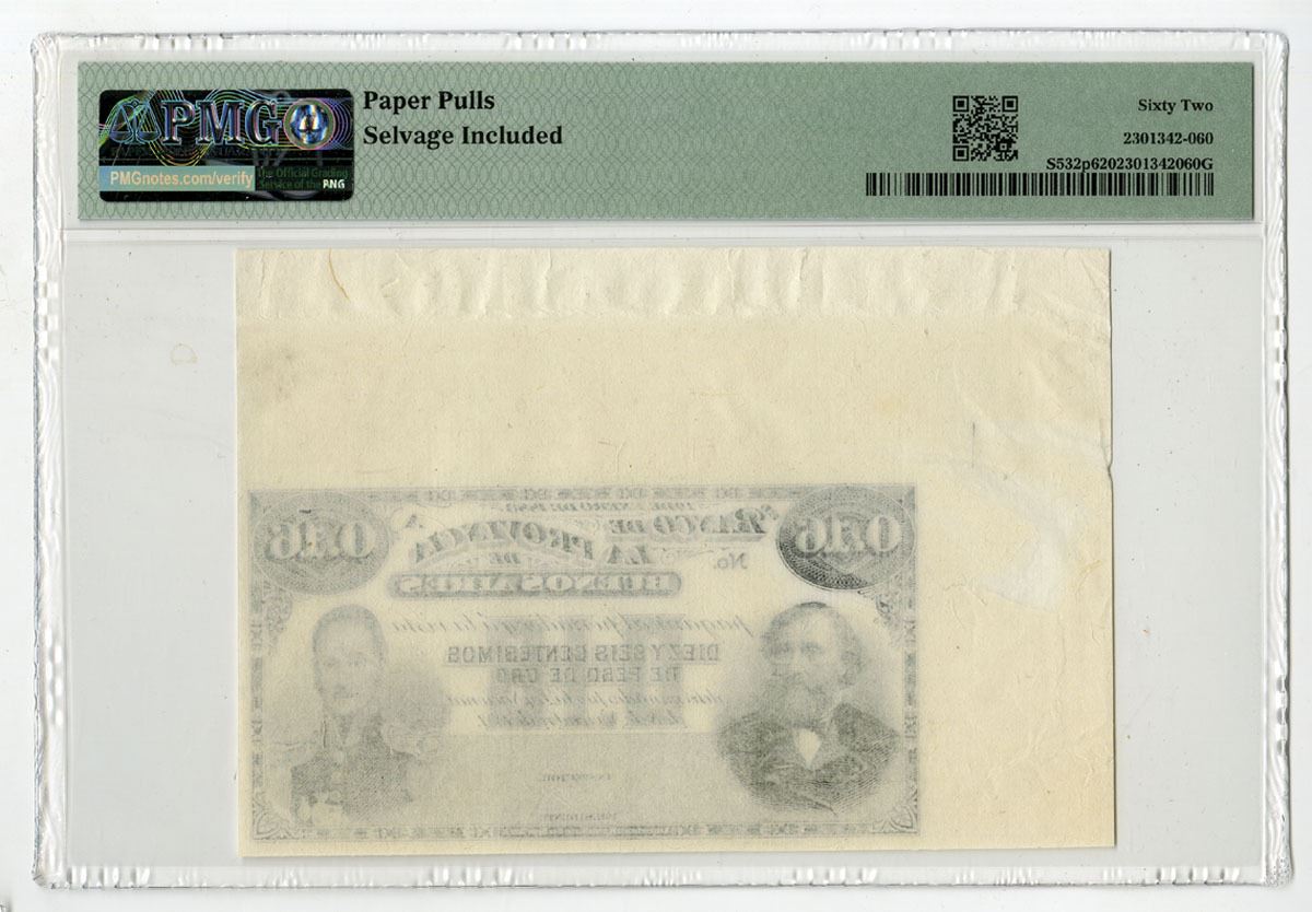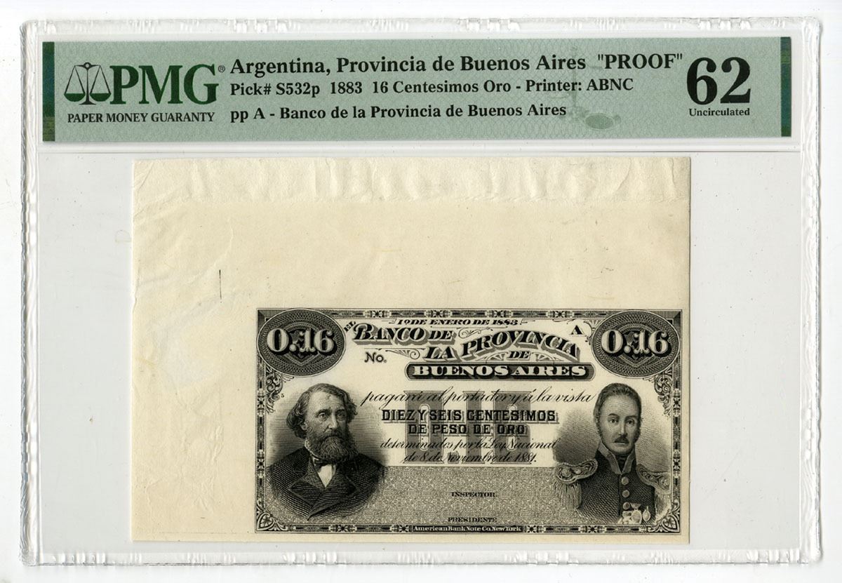 Buenos Aires, Argentina, 1883. 16 Centesimos Oro, P-S532p, Proof Banknote, Black printing with Portrait of General Mitre at left and Colonel Argerich at right, Uniface note, PMG graded Uncirculated 62 with comments "Paper Pulls, Selvage Included," ABNC. This is the highest graded example out of 3 notes graded in the PMG census.
