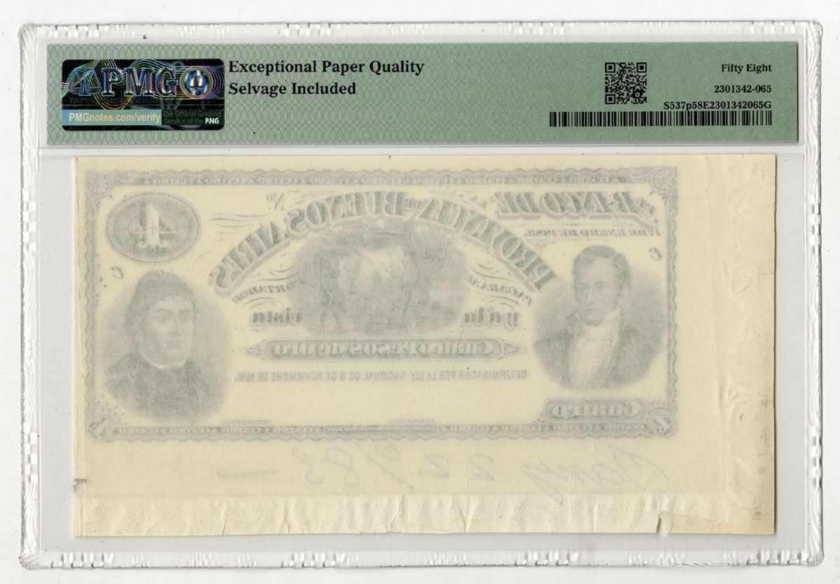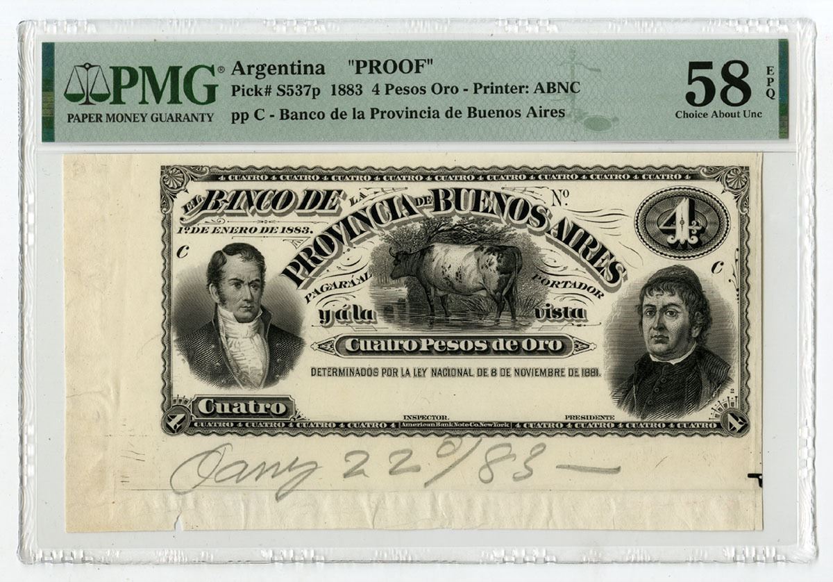 Buenos Aires, Argentina, 1883. 4 Pesos Oro, P-S537p, Proof Banknote, Black printing with Portraits of Dr. Alberti at left and J. Catelli at right with a cow at center, Uniface note, PMG graded Choice About Uncirculated 58 EPQ with comment "Selvage Included," ABNC. This is the highest graded example out of 5 notes graded in the PMG census.