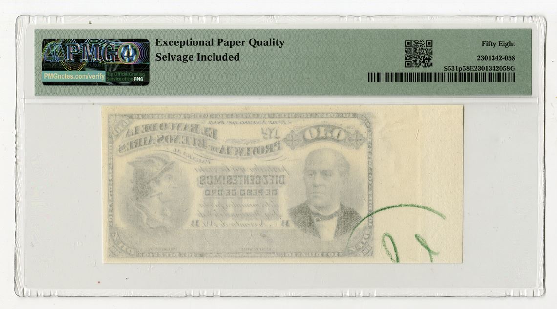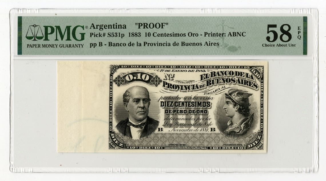 Buenos Aires, Argentina, 1883. 10 Centesimos Oro, P-S531p, Proof Banknote, Black printing with Portrait of Dr. Sarmiento at left and Mercury at right, Uniface note with green crayon marking at bottom right, S/N pp B, PMG graded Choice About Uncirculated 58 EPQ with comment "Selvage Included," ABNC.