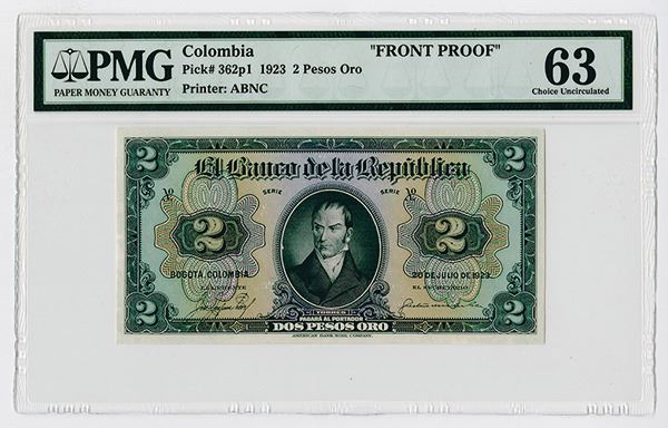 Colombia. Front Proof 2 Pesos Oro, 1923, P-362p1. PMG graded Choice Uncirculated 63 with comment "Printer's Annotation" (Cert # 8060193-024). ABNC. Rare early series.