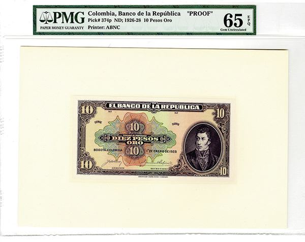 Bogota, Colombia. 1928, 10 Pesos, P-374p1 Unlisted Proof variety, Uniface Front banknote, no back, Purple on m/c undertint, Narino at right, PMG graded Gem Uncirculated 65 EPQ, ABNC. Rare variety with date.