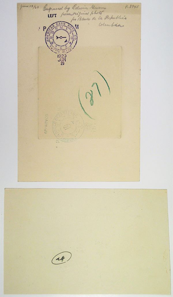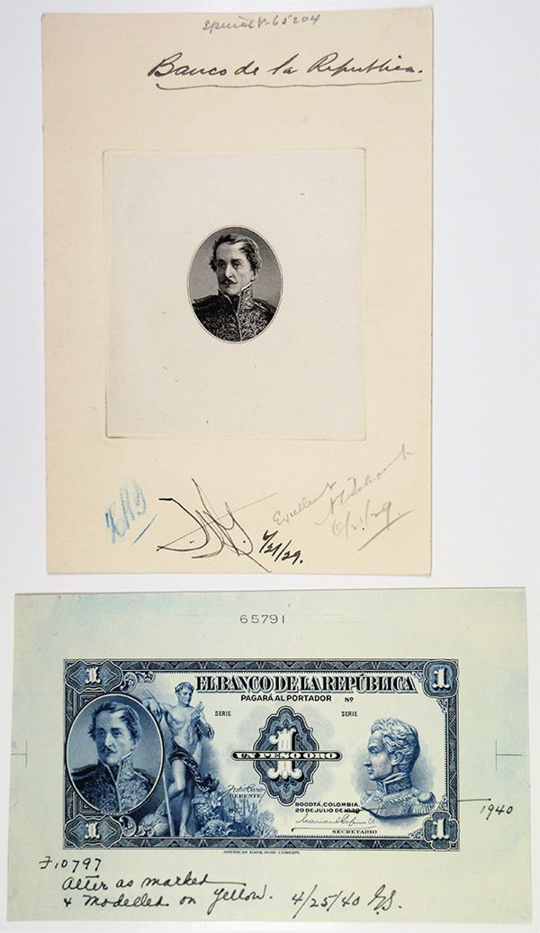Bogota, Colombia... Lot of 2 pieces, includes 1929, 1 Peso Large Die Proof used a model for alteration changes to be marked, P-380 Unlisted Progress Proof printed in blue without undertint, General Santander at left, Bolivar at right, blank back, Plate # 65791, bottom marked "Alter as marked + modelled on yellow, 4/25/(19)40 G.S.", and 1929 date crossed out and 1940 written; and Unique Large Die Proof of portrait of General Santander, approval signatures and production department notations, back has hand written "June 19, (19)29, Engraved by Edwin Gunn from original photo for Banco de Republica Colombia" with 2 different purple time hand stamps on back dated June 20 & 21, 1929, Choice to Gem Uncirculated condition. ABNC. (2)