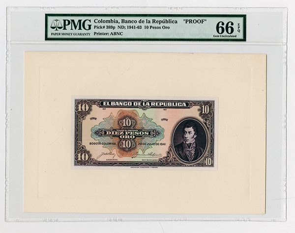 Bogota, Colombia. 1941, 10 Pesos, P-389p, Uniface Front Proof banknote, no back, Purple on m/c undertint, Narino at right, PMG graded Gem Uncirculated 66 EPQ, ABNC. Rare as a proof.