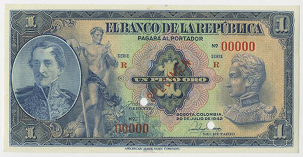 Bogota, Colombia... 1942, 1 Peso, Ser. R (Red), P-380cs, Specimen banknote, blue on m/c undertint, General Santander at left, Bolivar at right, back blue, Specimen overprints, POC's, Choice to Gem Uncirculated condition. ABNC.
