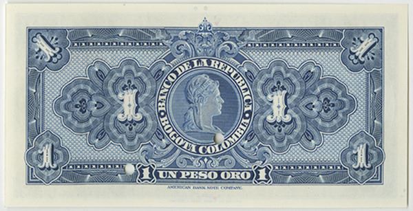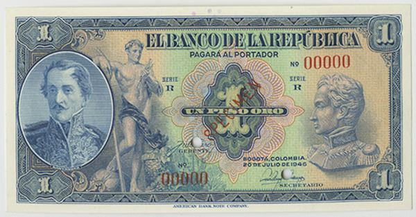 Bogota, Colombia... 1946, 1 Peso, Ser. R (Blue), P-380ds, Specimen banknote, blue on m/c undertint, General Santander at left, Bolivar at right, back blue, Specimen overprints, POC's, Choice to Gem Uncirculated condition. ABNC.