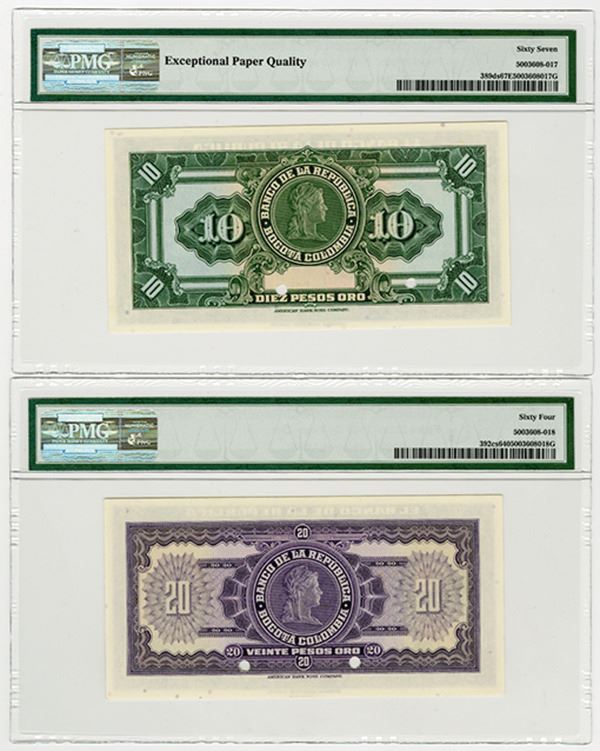 Colombia. Specimen 10 Pesos & 20 Pesos, 1947-1949, P-389ds & P-392cs. Both graded PMG graded Superb Gem Unc 67 EPQ (Cert # 5003608-017 & 5003608-018). ABNC.