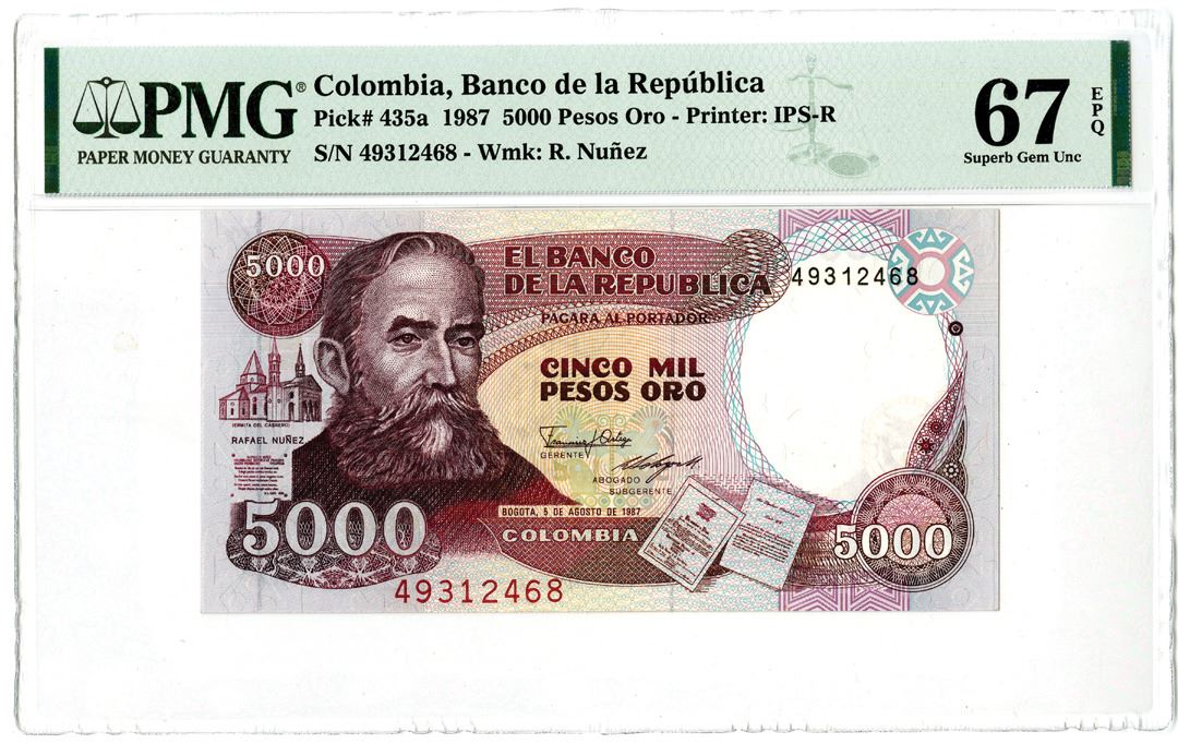 Colombia. 1987. 5000 Pesos Oro, P-435a, issued banknote, S/N 49312468. PMG Graded Superb Gem Unc 67 EPQ, IPS-R. Tied with 2 others out of 12 graded in the PMG census.