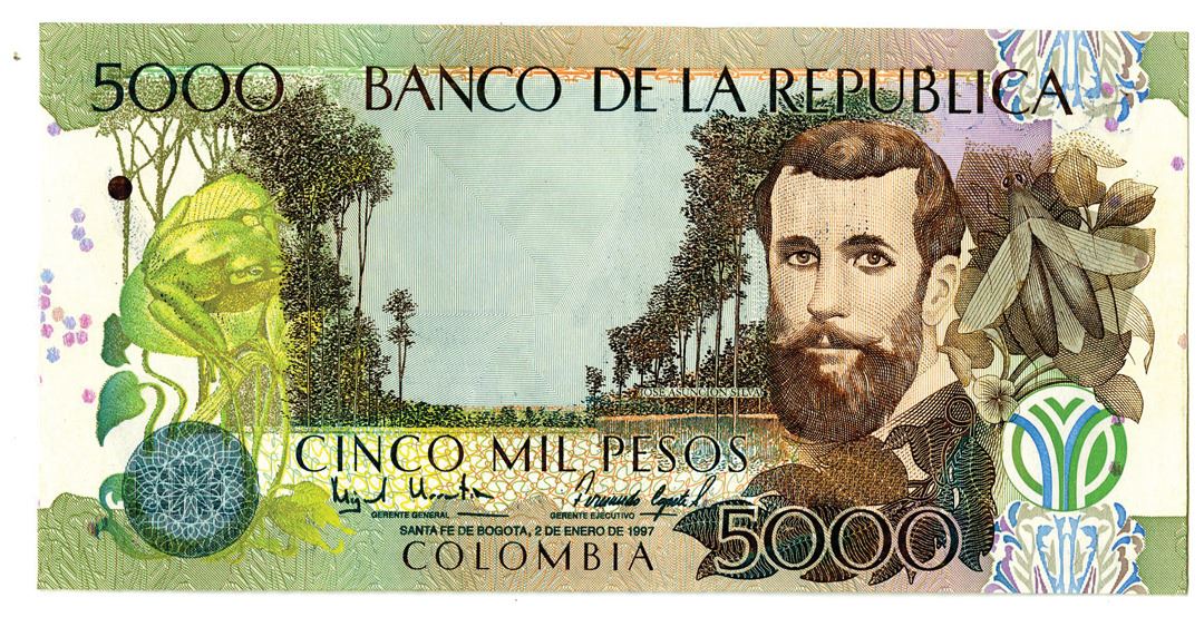Colombia. 1997. 5000 Pesos, P-446, Unissued banknote, Dark brown and deep blue-green on multicolor underprint, Watermark: J.A. Silva. Choice XF to AU. Printing Error, no S/N, by IBSFB.