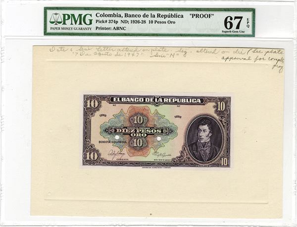 Bogota, Colombia. 1926-28, 10 Pesos, P-374p1 Proof Uniface Front banknote, no back, Purple on m/c undertint, Narino at right, PMG graded Superb Gem Uncirculated 67 EPQ, ABNC. Tied with one other note as finest known out of 14 graded in the PMG census.