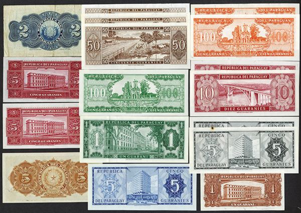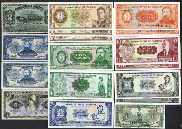 Paraguay. 2, 5 Pesos; 1, 5, 10, 50, 100 Guaranies. P-139a; 156; 181; 185a; 186a, c; 192 (2); 193a (both signature varieties); 194a; 195a (burn in margin), b; 196a, b; 197a, b (2); 198a; 199b (2). Early issues are Good to Fine, later notes are Uncirculated and very nice. 21 pieces.