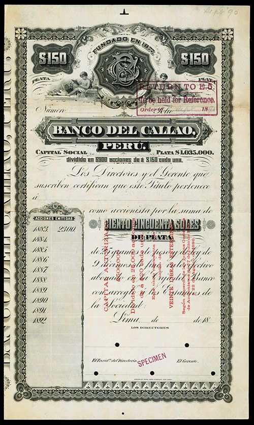 Peru, 18xx, $150, Specimen Bond, Black print with ornate black border and bank logo top center flanked by cherubs, POC's, VF condition, ABNC.
