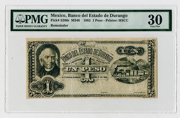 Durango, Mexico.... 1882, 1 Peso, P-S286r M346, Remainder banknote, Black printing without underprint, Hidalgo portrait at left, train at right, back green, PMG graded Very fine 30, Printer: H.S. Crocker & Co., San Francisco. Rare and attractive note. This is the only example to come to auction in the last 10 years in the Track and Price census and first time seen by the cataloger.