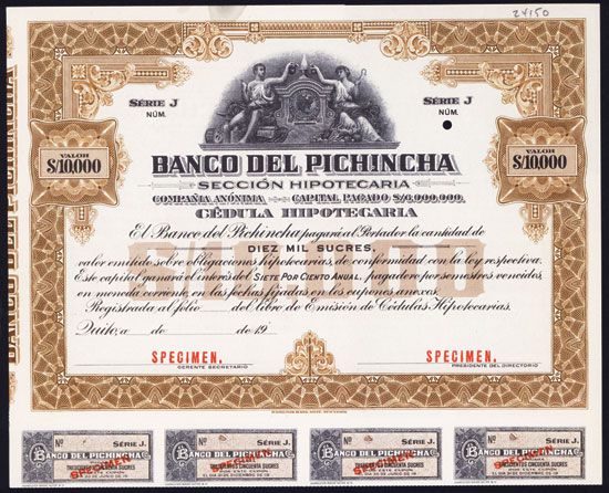 Quito, Ecuador, ND (ca.1920-30), Horizontal, S/10,000 Sucres, Serie J, Brown border with Allegorical couple vignette, Specimen overprints, POCs, Coupons attached, HBNC, XF condition.