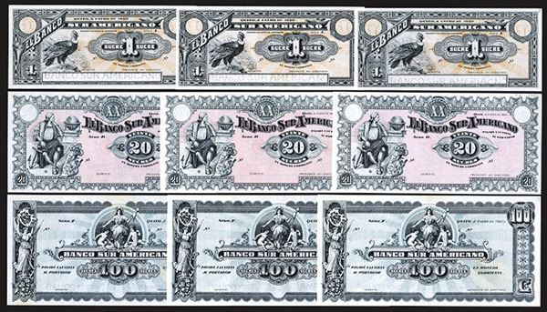 Ecuador. 1, 20, 100 Sucres. P-S251r; S253a; S254. Three of each. All Choice Uncirculated, with pencil notations in two right margin. 9 pieces.