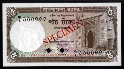 Bangladesh, ND (1981). 5 Taka, P-25as, Specimen banknote, brown on m/c, mosque on right, back is brown on m/c with factory. PMG graded "66 Gem Uncirculated, EPQ", scarce as specimen and in high grade.