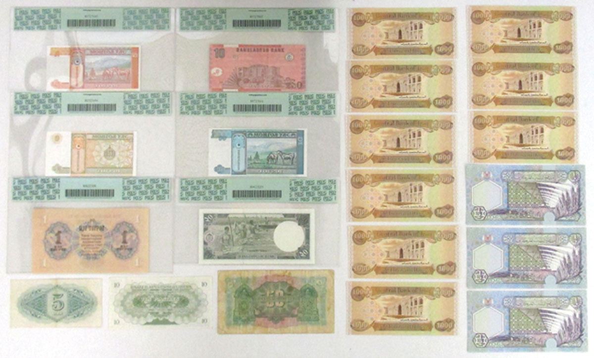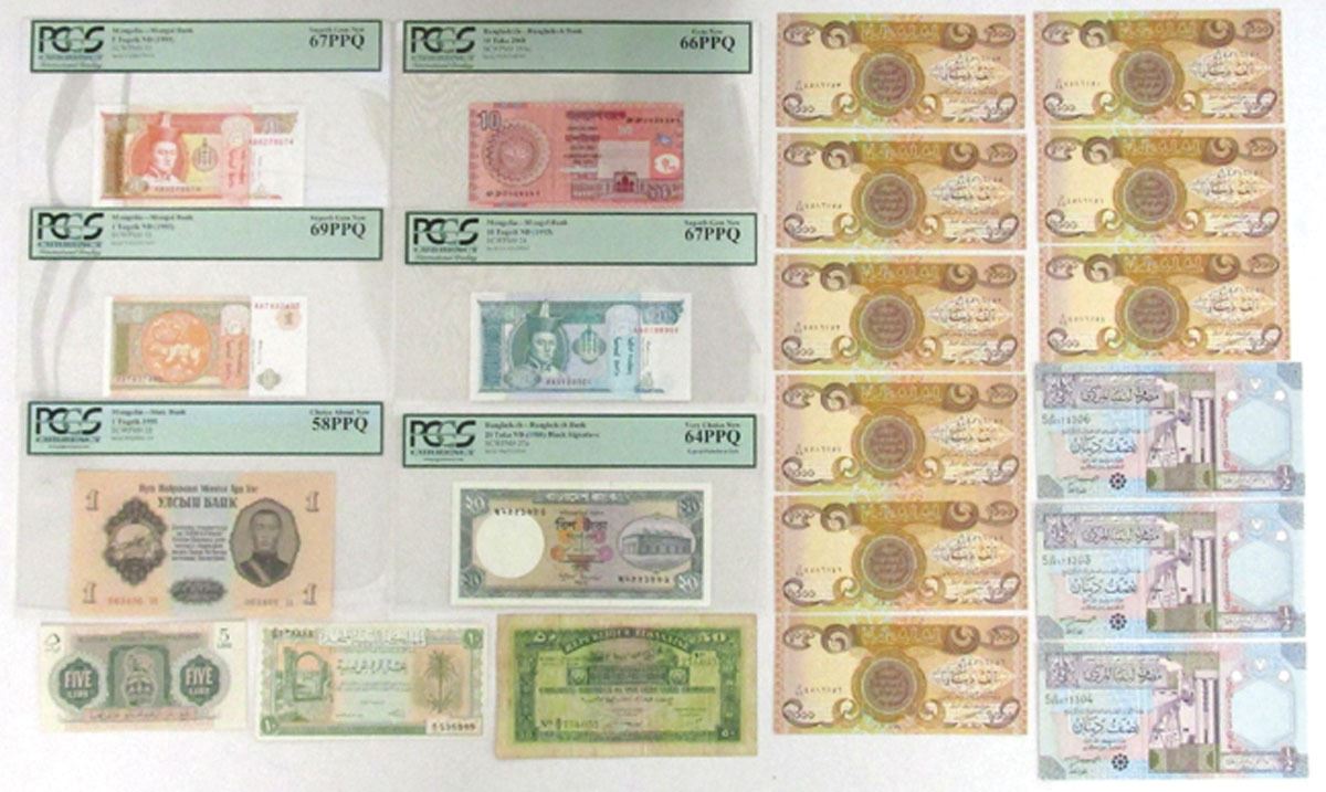 Middle East, South Asia, and East Asia, 1942 to 2008. Lot of 21 Issued Banknotes, Includes: 1942, Republic of Lebanon Government Banknotes 50 Piastres, P-37, BWC; ND (1943), Military Authority in Tripolitania 5 Lire, P-M3a; L.1951, United Kingdom of Libya 10 Piastres; 1955, State Bank of Mongolia 1 Tugrik, P-28, PCGS Choice About New 58PPQ; 2003, Central Bank of Iraq 1000 Dinars, P-93a (9), TDLR; ND (1993), Mongol Bank 1 Tugrik, P-52, PCGS graded Superb Gem New 69PPQ; 5 Tugrik, P-53, PCGS graded Superb Gem New 67PPQ; 10 Tugrik, P-54, PCGS graded Superb Gem New 67PPQ; ND (2002), Central Bank of Libya 1/2 Dinar, P-63 (3); ND (1988), Bangladesh Bank 20 Taka, P-27a, S/N Sa2551886, PCGS graded Very Choice New 64PPQ with comment "Typical Pinholes at Left;" 10 Taka, P-39Ac, S/N NN0208987, PCGS graded Gem New 66PPQ. Notes range from Fine to Superb Gem New condition. (21). Sold "AS IS" no returns accepted.