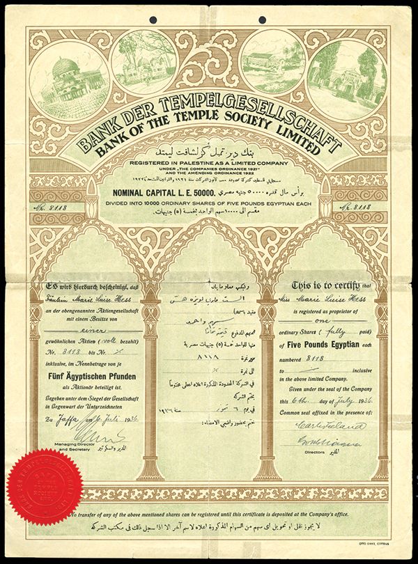 Bank Der Templegesellschaft, Bank of the Temple Society Limited, 1936, Stock or Share Certificate. Palestine-Israel, One share, Black, Brown and Green print on cream, Topical desert views, splits, some minor holes where folds meet, I/U, Fine condition but the certificate had been split and the tear retaped, images of Temples, Mosque and buildings, "Registered in Palestine as a Limited Co." Archivally Backed. POC, Scarce and very attractive.