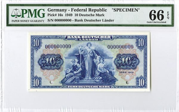 Germany, specimen 10 Deutsche Mark, P-16s, 2 POCs, PMG graded Gem Uncirculated 66 EPQ.