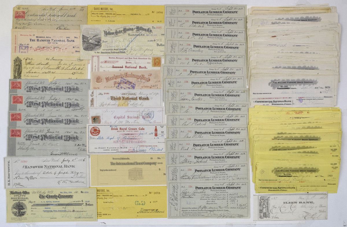 Sterling, Colorado and Northern States, ca. 1880-1950s. Lot of 350+ Bank Checks and Company Drafts, a majority of the checks and drafts are from Colorado, Willard Farmers Grain Co., (164 drafts, originally from Sterling, CO., but crossed out and Willard, CO. written instead); First National Bank of Hancock, NY; Third National Bank of New York; Second National Bank of Boston; Hanover National Bank; and Yellow Aster Mining & Milling Co., among others. Also features later corporate checks such as Davis Motors, Inc. and Royal Crown Cola advertising examples. Most are issued and cancelled, showing a variety of imprints, revenue stamps, and typed or handwritten entries. Conditions range from Good to Uncirculated overall, some with folds or ink toning typical for the period. (350+). Sold ‘AS IS’ no returns accepted.