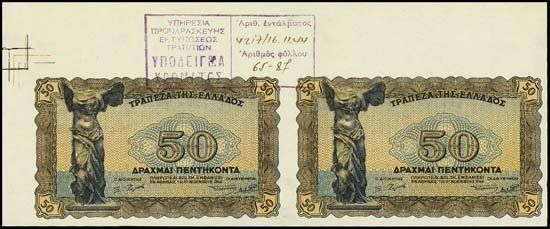 P-169 Unlisted Proofs. 50 Drachmai. 4 different progressive face proof pairs. 4 different uncut horizontal pairs with large top margins and archival hand stamp with dates 16-11-44. Includes one fully printed uniface front proof pair; 3 different progressive uniface front proof pairs of various color combinations. All are extremely rare and are from a new find. Choice to gem uncirculated. Printed in locally in Greece during the war.