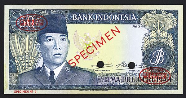 Indonesia, 50 Rupiah, P-85a Unlisted specimen, Blue on Light green and lavender instead of issued blue on light blue, portrait of Sukarno on left, S/N A 00000 and on the lower left border “Specimen No. 4”, Red oval “SPECIMEN - De La Rue & Co. Ltd. - No Value” overprints in red on face and back, The note appears Uncirculated to CU with evidence of previous mounting on the back right margin. Another rare Specimen and possibly a Color Trial. TDLR.