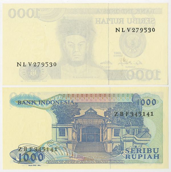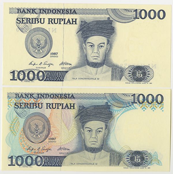 Indonesia. Issued 1000 Rupiah, 1987, P-124, major printing error with underprint missing on front, and all inking except serial number entirely missing from the back, including the underprint, text, and design featuring Kraton Ngayogyakarta Hadiningrat. Also included is a matching normal note for comparison. Both in Choice to Gem Unc.