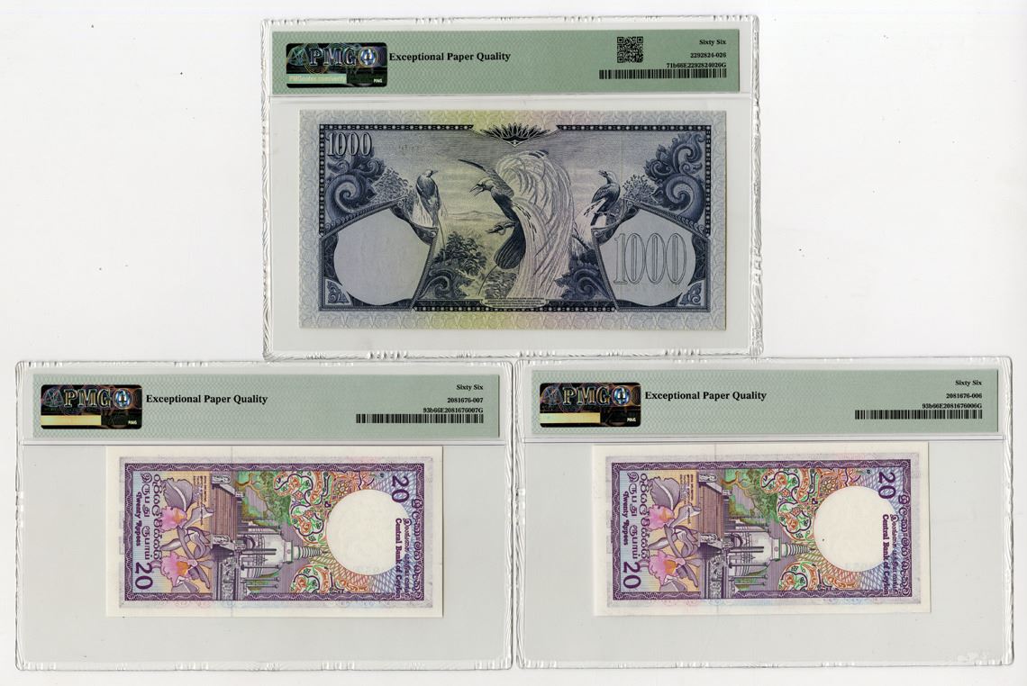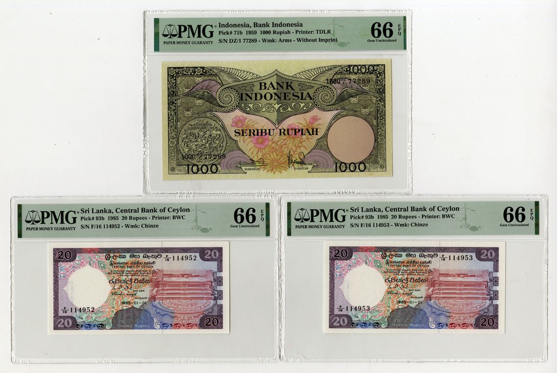 Indonesia & Sri Lanka, 1959 to 1985. Lot of 3 Issued Banknotes, Includes: Bank Indonesia 1000 Rupiah, P-71b, 1959, S/N DZ/1 77289, PMG graded Gem Uncirculated 66 EPQ, TDLR; Central Bank of Ceylon 20 Rupees, P-93b, 1985, Sequential Pair, S/Ns are F/16 114952 and F/16 114953, Both are PMG graded Gem Uncirculated 66 EPQ. (3). Sold "AS IS" no returns accepted.