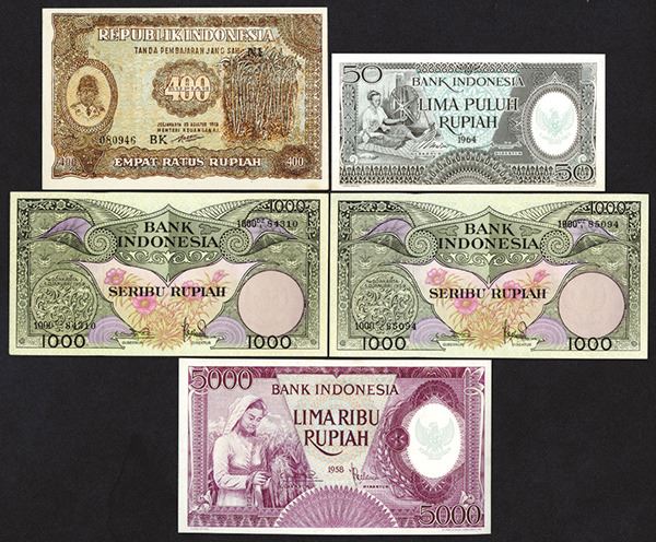 Indonesia. 50, 400, 1000, 5000 Rupiah. P-35a; 63; 71 (2); 96. Wonderful designs. All Choice Uncirculated. 5 pieces.