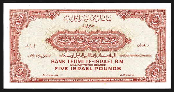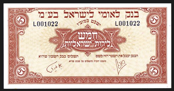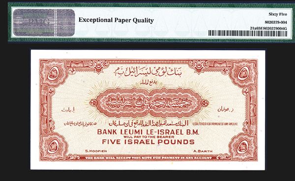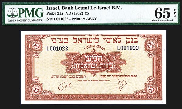 Israel, £5, P-21a, Issued banknote, Brown on yellow underprint, PMG graded Gem Uncirculated 65 EPQ. Attractive note rarely seen this nice. ABNC (Without imprint)