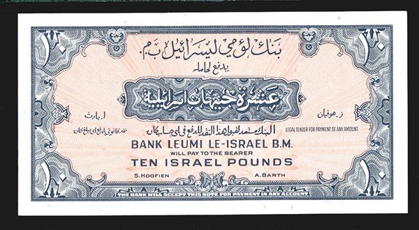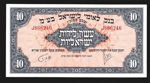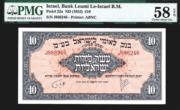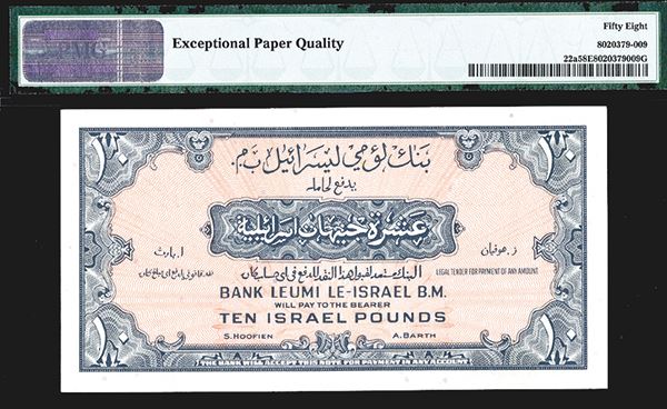Israel, £10, P-22a, Issued banknote, gray on orange underprint, PMG graded Choice About Uncirculated 58 EPQ. Attractive note. ABNC (Without imprint)