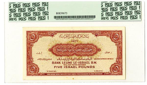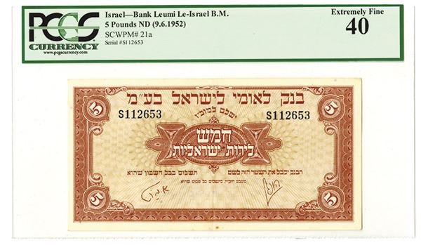 Israel, 5 Pounds, P-21a, issued banknote, brown on light brown, back same color, S/N S112653, PCGS Extremely Fine 40, Attractive note with large even margins, sharp corners and bright fresh appearance.
