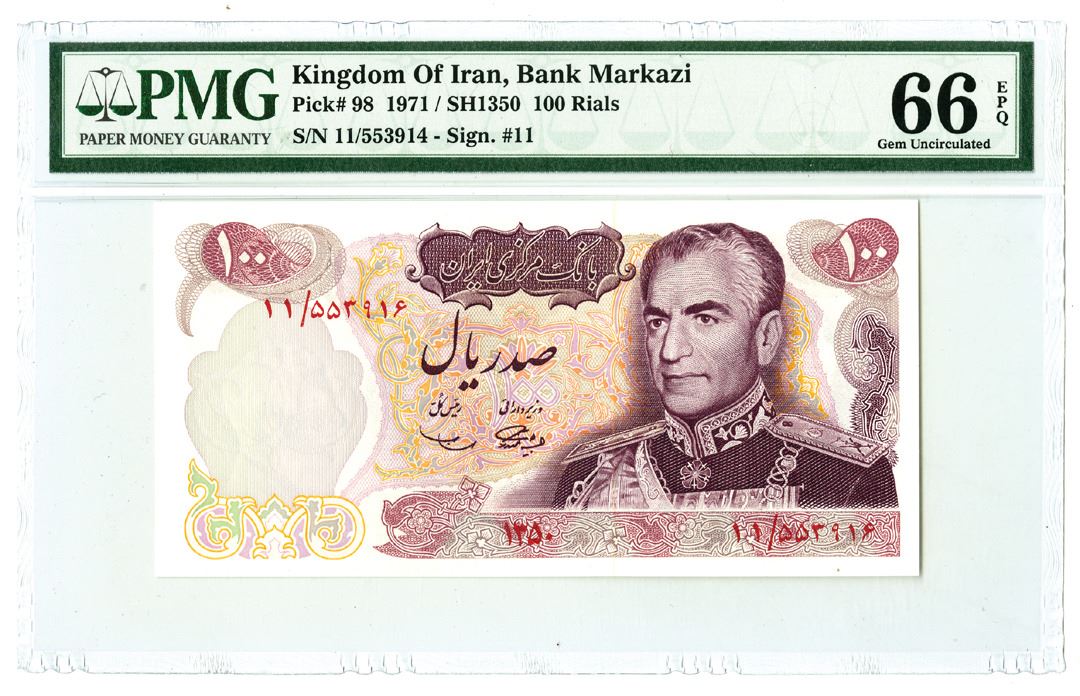 Iran, 1971/SH1350. 100 Rials, P-98, Issued Banknote, Maroon on orange and m/c underprint with floral and geometric design at center with type VIII portrait of Shah Pahlavi at right, Note was issued to commemorate 2,500 years of the Persian Empire, S/N 11/553914 Printer: TDLR, PMG graded Gem Uncirculated 66 EPQ.