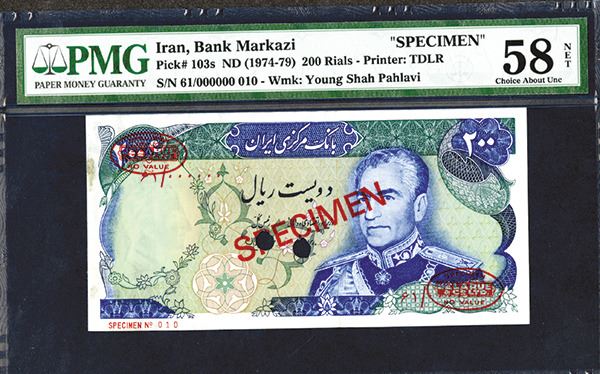 Iran. 200 Rials. P-103s. Shah Pahlavi at right. TDLR Specimen ovals at top left and bottom right corners, SPECIMEN across center in red. SPECIMEN No. 010 in lower margin. POC. PMG graded Choie About Uncirculated 58 NET Previously mounted notation.
