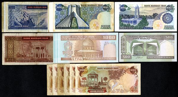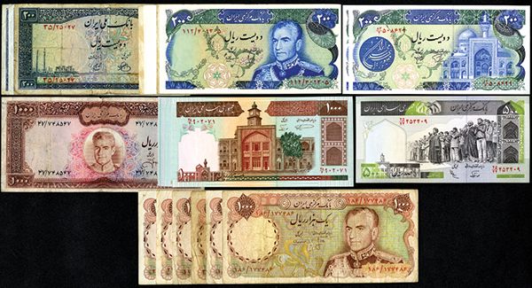 Bank Markazi Iran, 1951-2002, Group of 35 Iran, lot of 35 issued notes, includes 200 Rials, P-58, Fine; 200 Rials, P-87 (2 pcs); 1000 Rials, P-94; 200 Rials, P-103 (10 pcs); 1000 Rials, P-105 (6 pcs); the rest modern 200, 500, and 1000 Rial notes. Average F-VF for earlier notes, modern virtually all UNC.