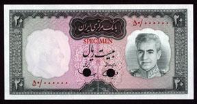 ND (1969). 20 Rials, P-84 Unlisted Color Trial, Green and m/c underprint on face with portrait of Shah Pahlavi instead of issued dark brown with m/c, back. Red specimen overprints, "000000" serial numbers and POC's. Choice uncirculated. Rare as color trial. Harrison Printer.