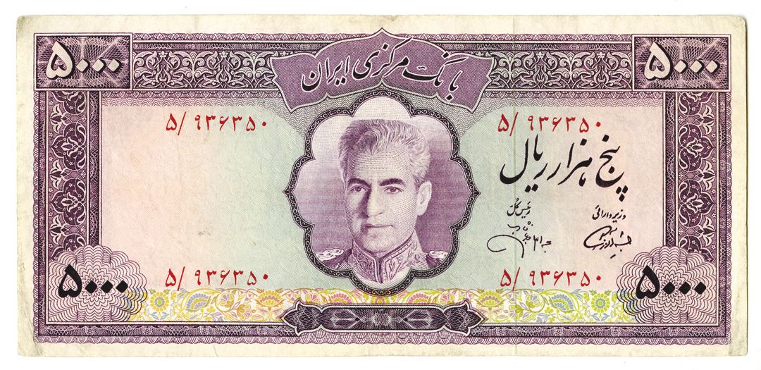 Iran. ND (1972). 5000 Rials, P-95b, issued banknote, Choice Fine to VF condition, 4 large and even margins and bright colors with light soiling.