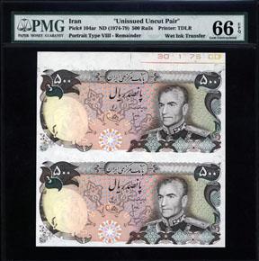 ND (1974-79), 500 Rials, P-104ar, Portrait type VIII, Signature type 15, uncut vertical pair of 2 partially printed notes, missing serial numbers. Large margin on top with red numbers printed. Housed in a PMG holder and graded "66 EPQ", Exceptional Paper Quality, Gem Uncirculated, "Wet Ink Transfer" error. Rare as uncut sheet. TDLR. Please see the other Iran sheets varieties