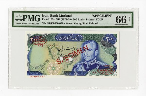 Iran. Specimen 200 Rials, P-103s, Sign. 18, No. 036, PMG graded Gem Uncirculated 66 EPQ. TDLR.