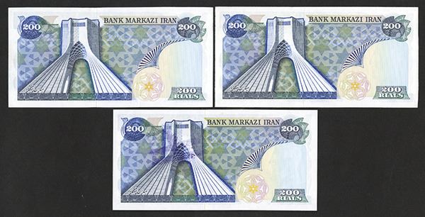 Iran, lot of 3 issued notes, includes 200 Rials, P-103a, Uncirculated to CU condition, one of which has an overprint obliterating the Shah's face, likely a transitional or unofficial modification to the note. Certainly an unusual find.